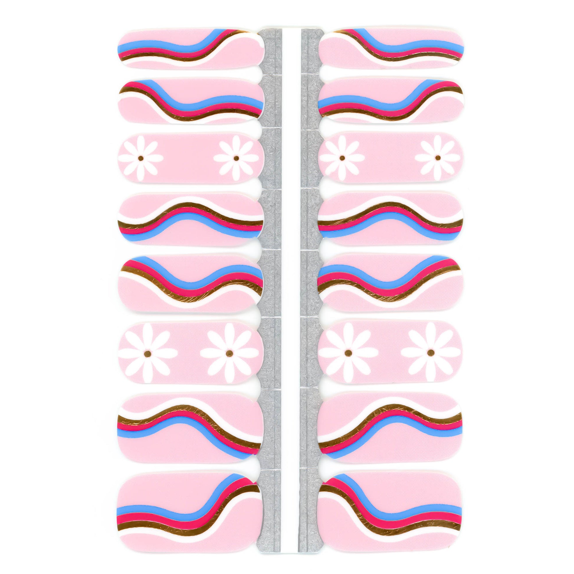 Light pink nail wraps with blue, red, gold and white wavy stripes on 12 sizes. White daisies on on the remaining 4 nail wraps.