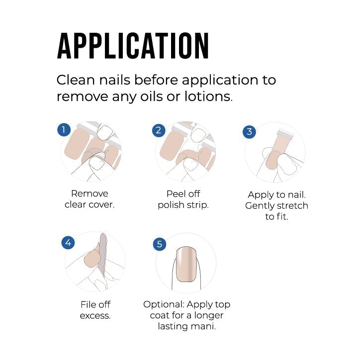 Application Tips: Buff out nails before using prep pad to help nail wrap adhere to nail surface. Let nail polish wraps set for at least an hour before prolonged water exposure, like showering.